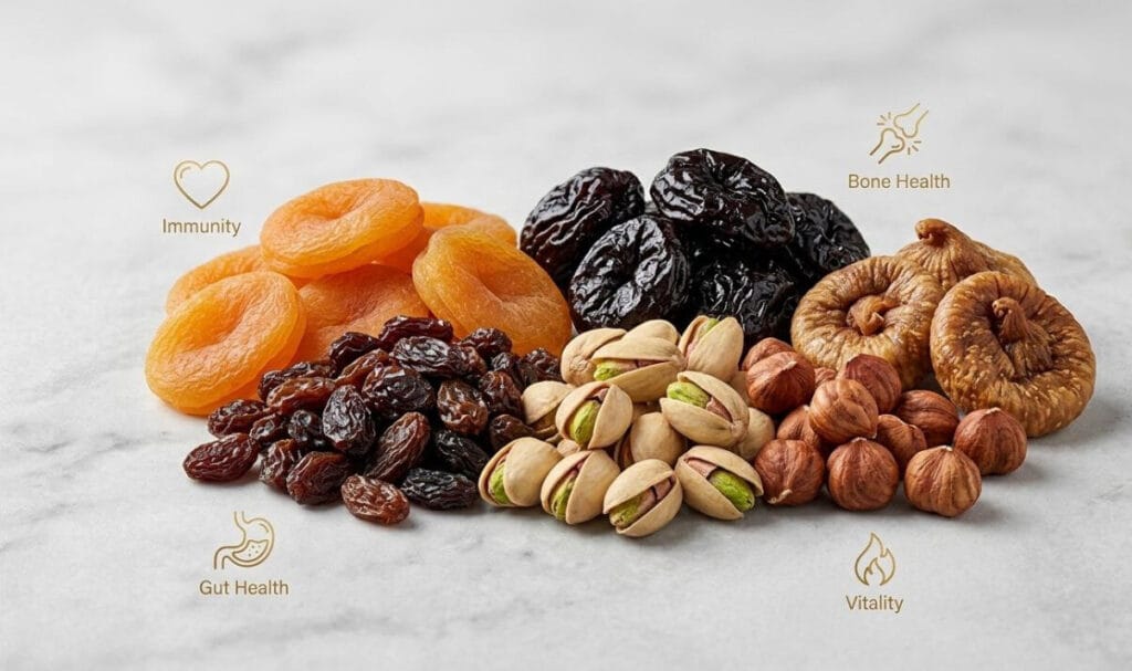 الفواكه الجافة مليئة بالزيوت الأساسية والبروتينات والبوتاسيوم والكالسيوم التي تساعد على زيادة مناعتك. كما أن وجود مضادات الأكسدة فيه يمكن أن يساعدك على محاربة الالتهابات والأمراض المختلفة.